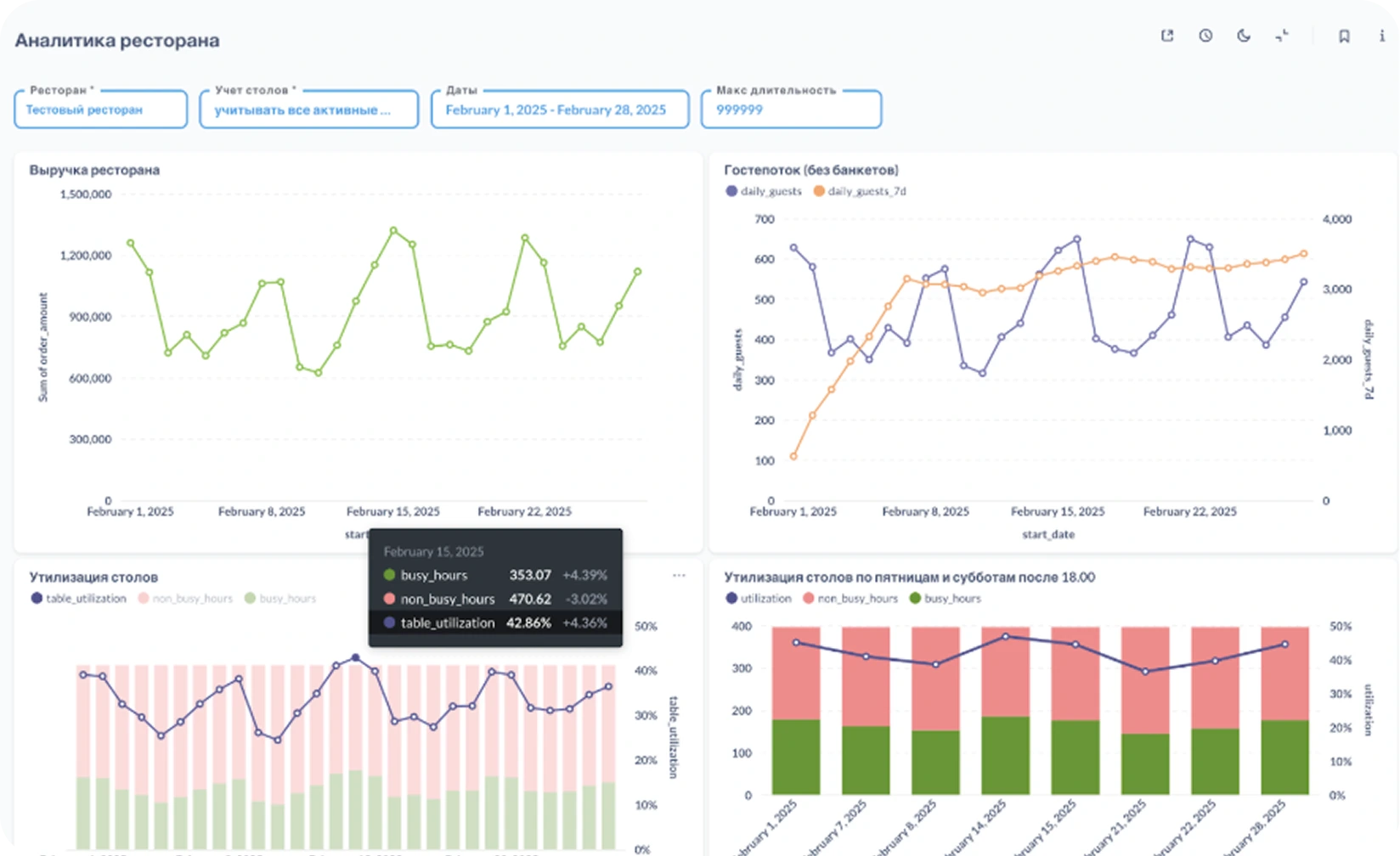 Предлагайте безупречный сервис с системой ИИ-прогноза очередей. Система автоматически рассчитывает загрузку и время освобождения стола с точностью до 5-7 минут, что позволяет повысить выручку в пиковые часы более чем на 10%